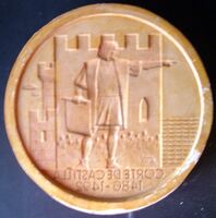 Cortes de Castilla nº 4 Molde de escayola del negativo de la cara de una medalla con la imagen en primer término de colón señalando a un punto concreto sobre la fachada principal de un castillo donde sea precia las cabezas de una multitud de gente.Para Numismática Iberica, anverso. OTROS ARCHIVOS RELACIONADOS: MBO/393+435+436 MG/1532 MBR/1336