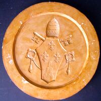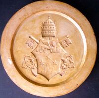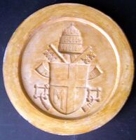 Escudo Pontificio Pablo VI Molde de escayola de la cara de una medalla donde se aprecia un escudo pontificio con la tiara Papal y las llaves que simbolizan el dominio de san Pedro sobre el cielo y el infierno.Para Instituto Numismático. Otros Archivos.: MBO/522