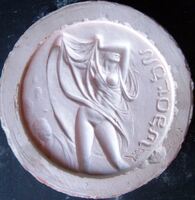 Acuario Molde de escayola con barniz de goma laca de una de las caras de la medalla representativa del signo del zodiaco Acuarios con la imagen de una mujer vertiendo agua del cántaro que sujeta sobre su hombro.OTROS ARCHIVOS: Mbo/319 MG/1415