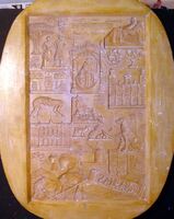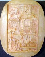 Aragón Molde de escayola del negativo de una medalla de la Comunidad Aragonesa, donde en primer término se aprecia la figura de una pareja de maños bailando una jota, junto a la Virgen del Pilar y la Basílica del Pilar en Zaragoza.Negativo de escayola de la medalla Cdad. De Arsgon Otros archivos: Mbo/360 Mbr/1372