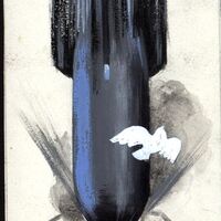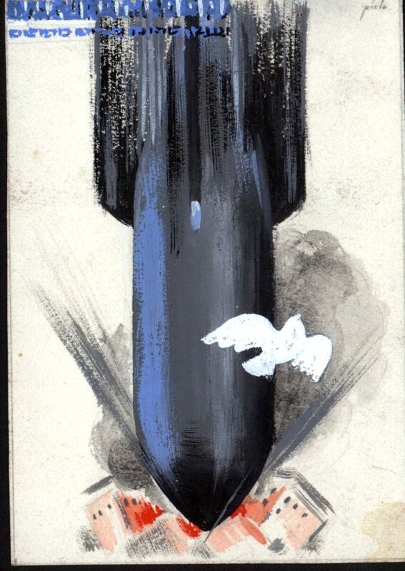 Sobre un fondo blanco, contrasta la figura de un proyectil en negro y azul impactando sobre una ciudad, en la cabecera de dicho proyectil, la figura de una paloma blanca alzando el vuelo, insinuando así que no son tiempos para ella, para la Paz, que es lo que representa sino todo lo contrario, obligada por tanto a alzar el vuelo, en la parte inferior del cartel unas casas donde impactará el proyectl. Firma abreviada en la parte superior derecha del cartel.