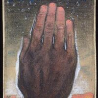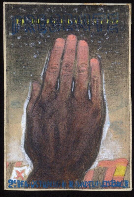 - La imagen del cartel, es el dorso una mano masculina que ocupa todo el espacio, por encima y por debajo de ella se leen unos rótulos acompañados por banderas, como la de España o la falange.En la parte superior se dislumbra un rotulo de letras en color azul y amarillo , en la inferior del cartel lo mismo pero solo en azul.