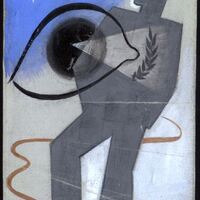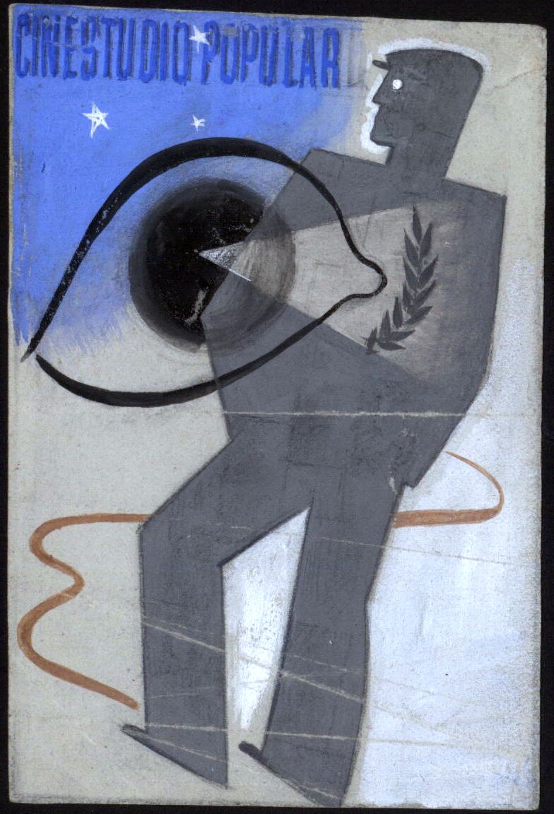 - Cartel en su mayoría con diferentes tonalidades de grises y azules, donde un gran ojo en negro simula un proyector que transmite la imagen de una palma de laurel, sobre ello un fondo gris que perfila la figura de un hombre con las manos metidas en el bolsillo.En la parte superior del cartel se lee la leyenda "Cinestudio Popular"
