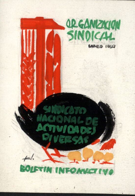 Cartel con fondo blanco, con leyendas respecto al boletín sindical y sus actividades, ocupando parte del fondo lateral del cartel la figura de un martillo rodeado de espigas de trigo en rojo y en primer término un ave negra cobijando a un grupo de poyuelos Firmado en la parte inferior izquierda del boceto.En negro en la parte superior derecha se lee "MARZO 1960"