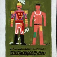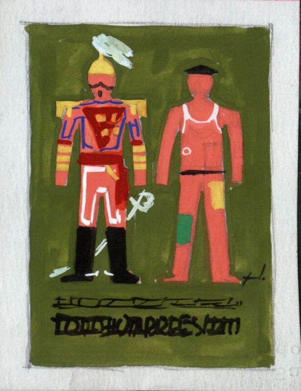 - Cartel con la imagen en paralelo de dos figuras masculinas, uno vestido de forma popular representando a un hombre rural, sencillo, y el otro todo lo contrario, uniformado con sus mejores galas. Fomdo del boceto verde, en la parte inferior esbozado la leyenda del futuro cartel, lam firma en el margen inferior izquierda garabateada.