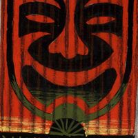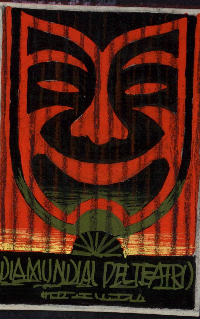 - Sobre un fondo rojo perteneciente al telón de un escenario, el dibujo en trazos negros de una gran máscara griega icono del teatro. La máscara tiene un dramatismo que la acerca a la cultura oriental.En la parte inferior la leyenda "DIA MUNDIAL DE TEATRO en verde
