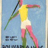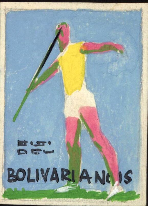 - Bellísimo cartel que representa una monumental figura de un atleta en el lanzamiento de jabalina, sobre un fondo azul claro. Debajo del personaje central los rótulos de los juegos. Leyenda "… BOLIVARIANOS"