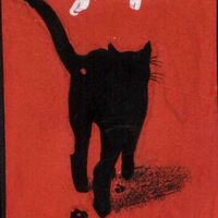 - Sobre un fondo rojo, visto de espaldas, un gato negro andando, marcando con huellas sus pasos, con un rótulo en blanco donde se lee “Gráficas”, en la parte superior del boceto.