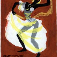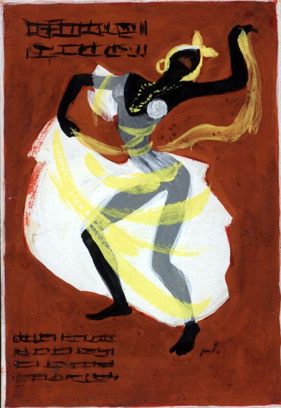 - La figura de una mujer mulata, con vestido blanco, representando con gran expresividad los movimientos rítmicos del baile. El juego de transparencias y de combinación de colores resulta ejemplar.