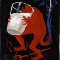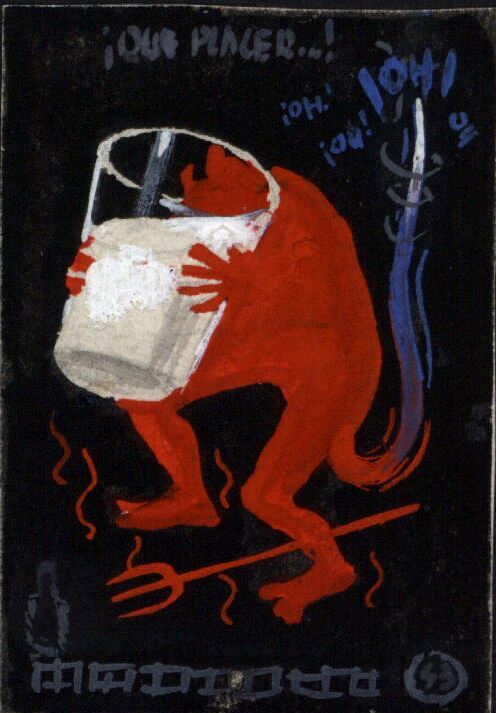 - En el centro de la imagen, la figura de un demonio rojo con tridente en el suelo, bebiendo de un vaso gigante. El atractivo publicitario del demonio se podría veinte o treinta años después de moda.En la parte superior se lee la leyenda "¡Que placer…! OH OH …