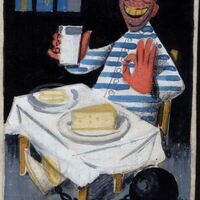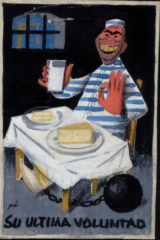 - Cartel con la imagen de un preso, sentado a una mesa, con una mano sujetando un vaso de leche y en la mesa productos lacteos, con la otra saludando con gesto sonriente, diciendonos ok, al fondo de la escena una pequeña ventana con barrotes y tras ella, el pativulo de su ejecucion. Leyenda "Su última voluntad"