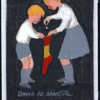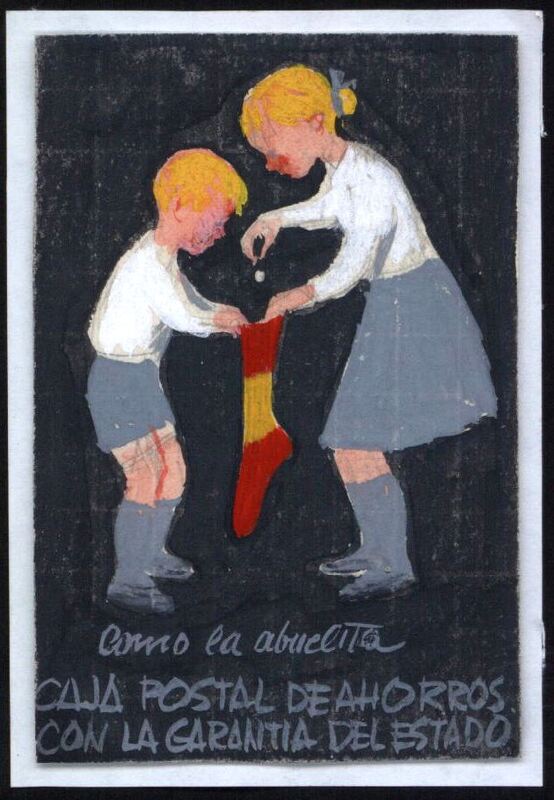 - Boceto de un cartel, donde se ve a una pareja de dos niños sujetando un calcetín con colores de la bandera, introduciendo una moneda, debajo de ellos se puede leer “como la abuelita”."CAJA POSTAL DE AHORROS CON LA GARANTIA DEL ESTADO."