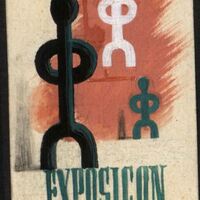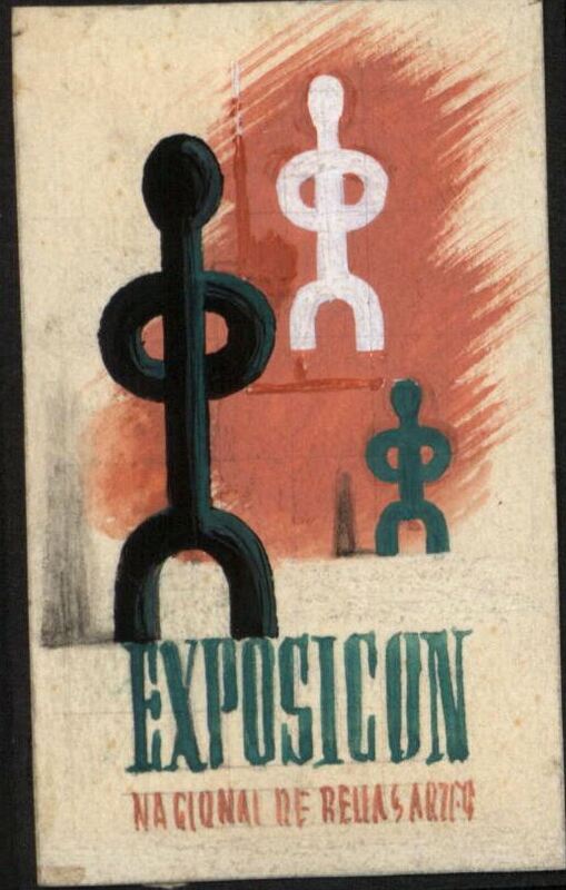 - Sobre un fondo claro, las siluetas esquemáticas de figuras situadas en distintos planos creando sensación de profundidad. Aunque muy superficialmente, el boceto está cuadriculado para traspasarlo a un tamaño mayor Leyenda "EXPOSICION NACIONAL DE BELLAS ARTES".