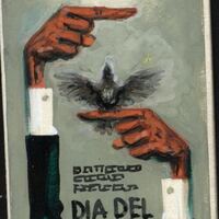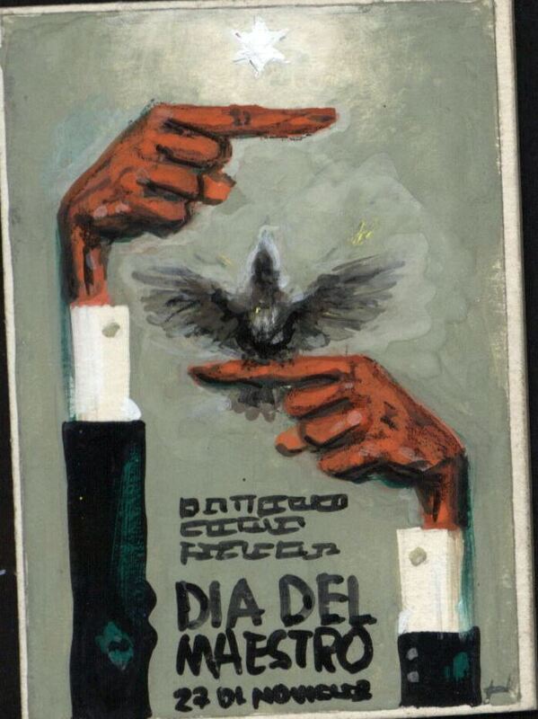 - Cartel donde se aprecia los brazos de un hombre en alto sujetando en sus manos un pájaro que se posa en uno de sus dedos, enseñandole para que aprenda a ir al otro dedo como hacen los maestros con…Leyenda "… DIA DEL MAESTRO 27 NOVIEMBRE "