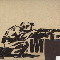 - Escena apaisada, con la figura de un soldado sujetando un rifle, silueta formada por contraste en blancos del fondo con los trazos en negro de las formas que componen la imagen del personaje.