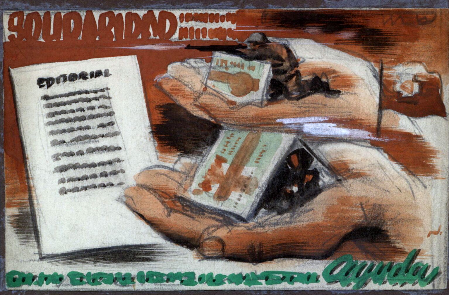 - Cartel con la imagen de las palmas de dos manos abiertas, en una de ellas la figura de un soldado disparando, junto a ella una carta escrita, y tanto en la parte superior como inferior del cartel rótulos donde se leen las palabras, solidaridad y Ayuda