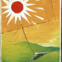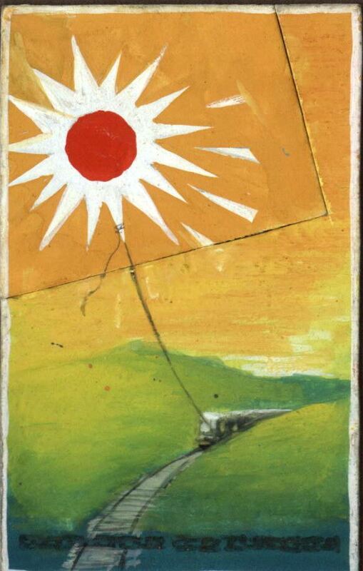 - La imagen de un tren en la lejanía que se va acercando por las vías que conforman parte del paisaje, también la imagen de un sol blanco con círculo rojo como collage, de donde cuelga un hilo sujeto al tren.