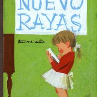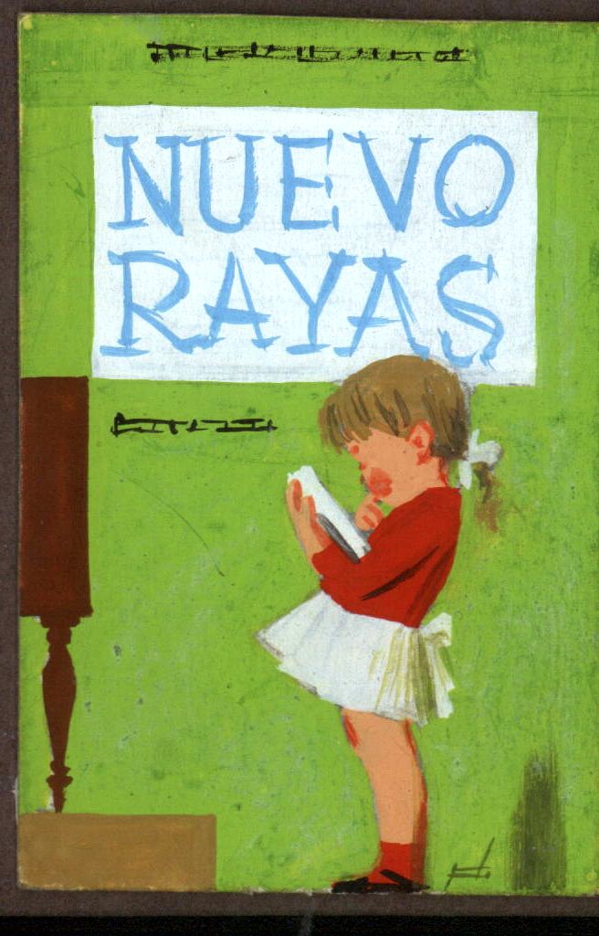 - Imagen de una niña leyendo atentamente el libro que sujeta en sus manos, en un lateral de la escena una parte de un podio y sobre él la esquina de una mesa. Tras la mesa se puede imaginar la figura de la maestra. Una ilustracion para la cartilla de titulo Nuevo Rayas. La firma en la parte inferior del boceto a la derechaEditada la cartilla
