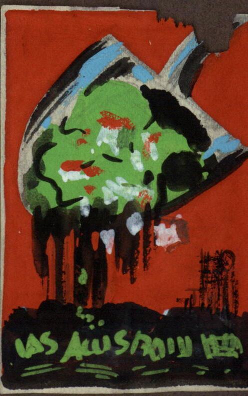 - La imagen de una gran pala llevandose un pueblo, sobre un fondo rojo, donde a lo lejos se intuye mediante un apunte en negro de una estructura de sondeos de pozos petroliferos. La sordidez del cartel nos hace pensar en algo relativo al progreso.