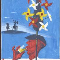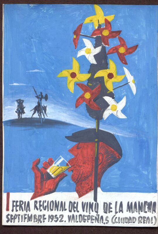 - Sobre fondo azul, se observa en lo lejos una colina con las siluetas de Don Quijote Y Sancho, y en primer término la cara de perfil de un hombre con gorra bebiendo una vaso de vino. Leyenda: FERIA REGIONAL DEL VINO DE LA MANCHA SEPTIEMNRE 1952. VALDEPEÑAS (Ciudad Real)