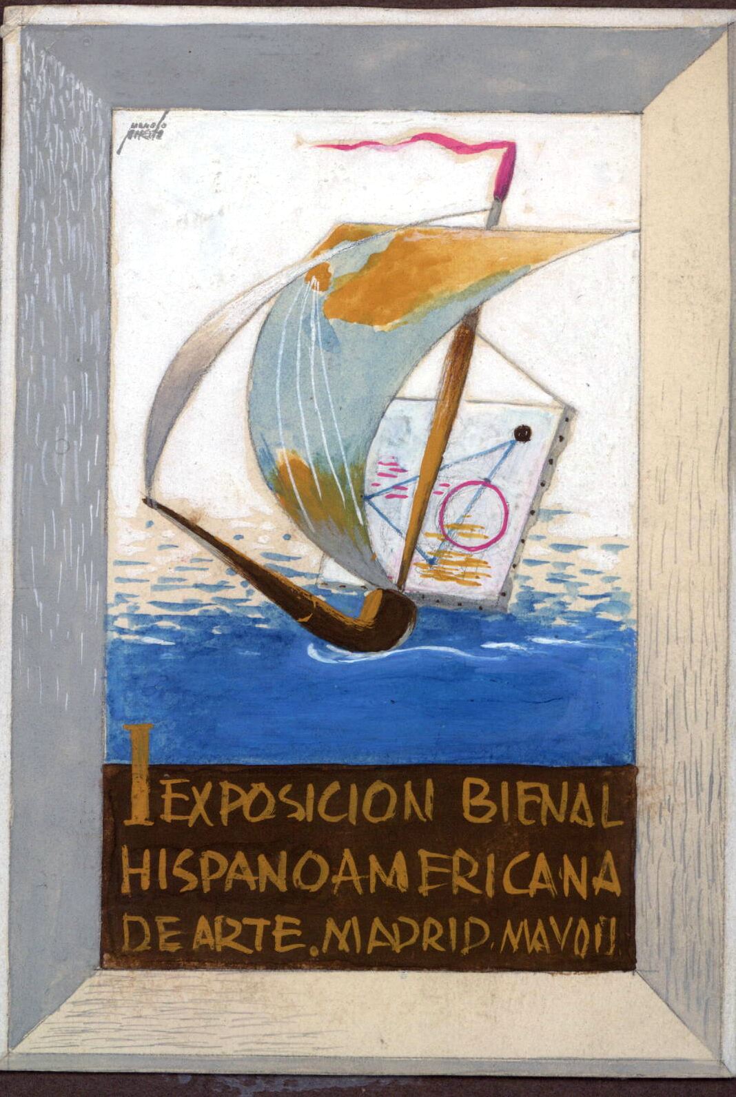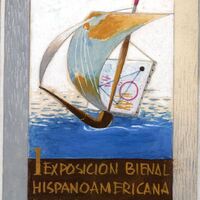 - Tras el marco de una ventana, que simula el marco de un cuadro real, la escena de un paisaje marino, sobre el mar un barco formado por una pipa , un pincel, un lienzo y una vela. Leyenda: I EXPOSICION BIENAL HISPANOAMERICANO DE ARTE, MADRID MAYO…