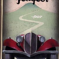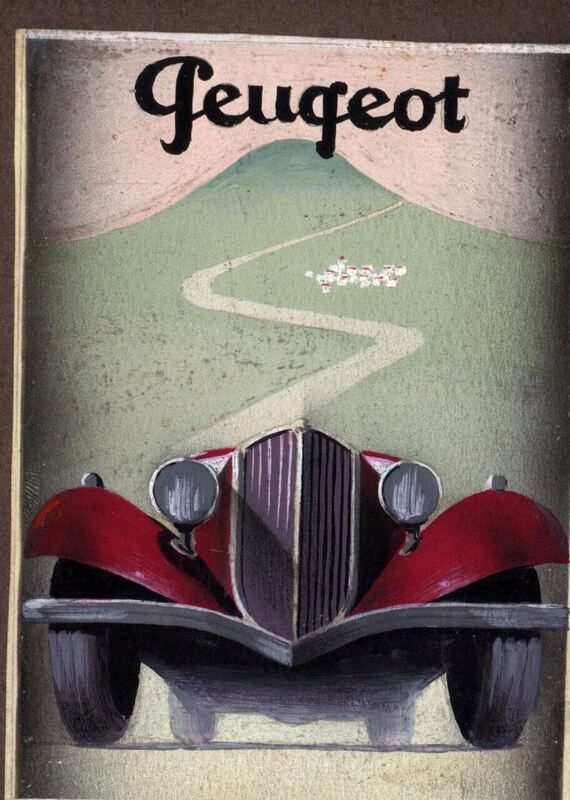 - Cartel donde se representa la parte frontal de un coche (ahora antiguo), detrás se observa en tonos verdes una colina con la silueta de un camino en zig–zag. La monumentalidad del coche se consigue por el punto de vista bajo del artista. Leyenda "Peugeot".