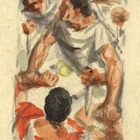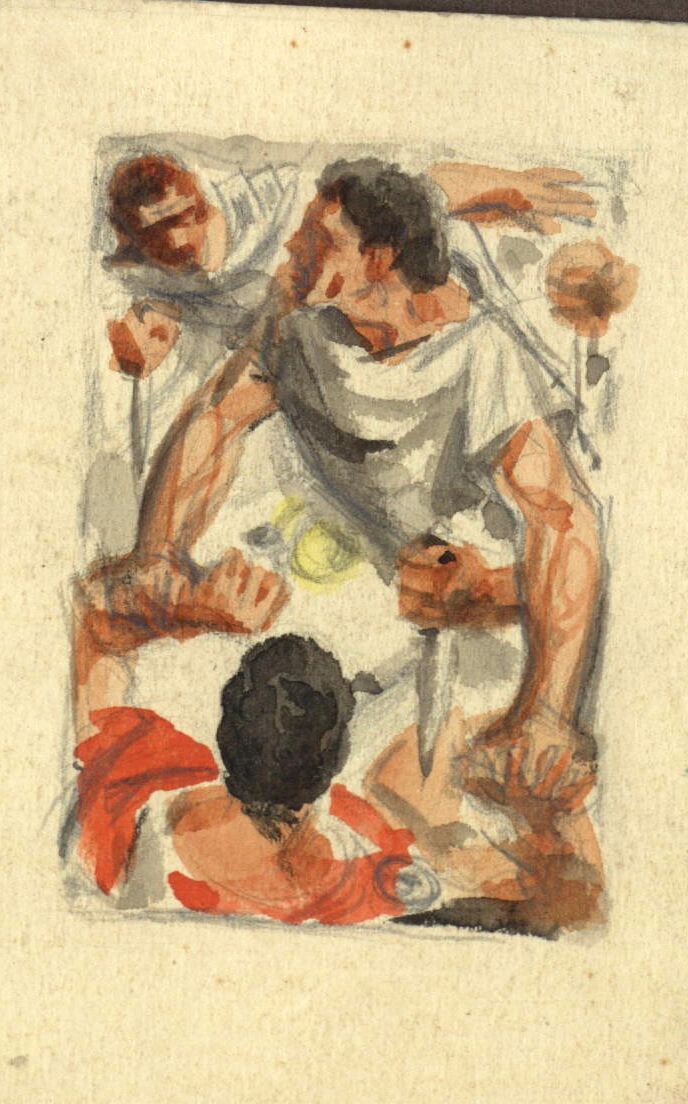 - Imagen de un hombre sujetando a otro, en un segundo plano un tercer hombre con aptitud de ayuda y una mano sujetando un puñal, por la vestimenta de los personajes sabemos que representan una escena de época Romana.