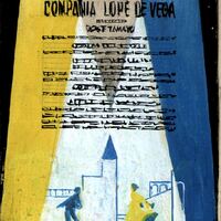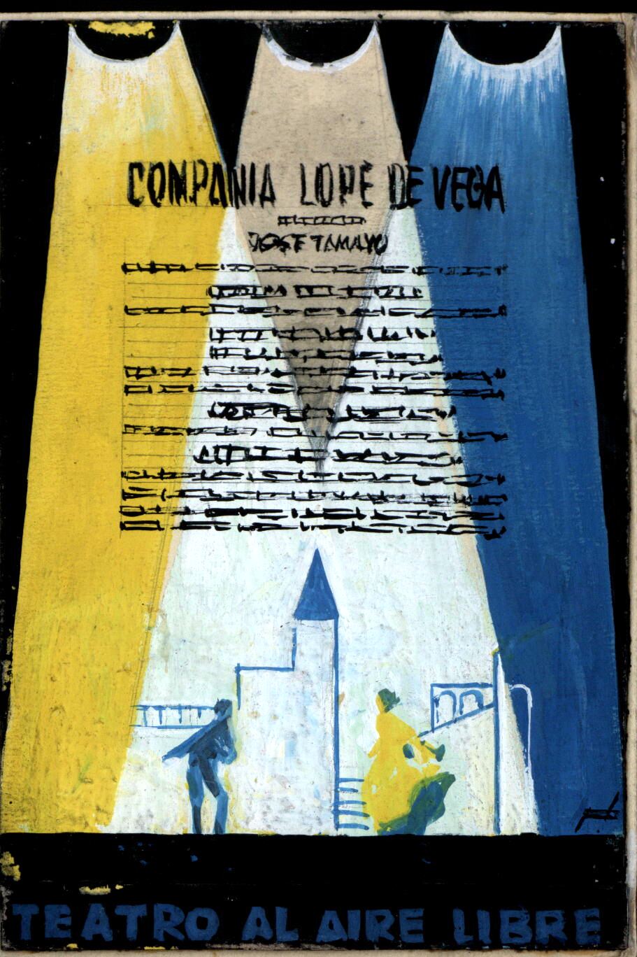 - Cartel que corresponde a la compañía de Lope de Vega, con la imagen de tres focos iluminando con diferentes intensidades que se cruzan creando una luz blanca que ilumina la escena donde aparecen dos figuras, hombre y mujer de amarillo sobre un escenario.