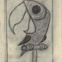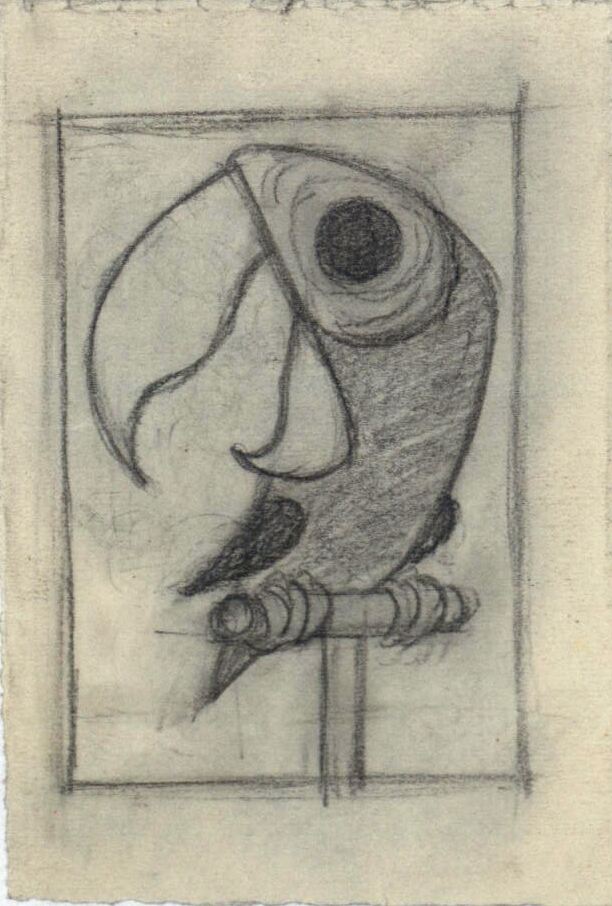 - La figura de un loro, con su cabeza ligeramente torcida y su gran pico abierto, que se apoya sobre una barra es el tema central en este dibujo enmarcado donde predomina el color grisáceo con tonos azulados.