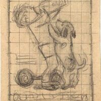 Destaca en esta imagen de perfil la figura de un niño pequeño bebiendo biberón mientras un cachorro se apoya en sus piernas. Por detrás del niño hay una pelota en el suelo y en la parte inferior se destaca una frase con letras ilegibles. En este dibujo enmarcado de superficie cuadriculada destacan las líneas en tonos oscuros.