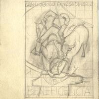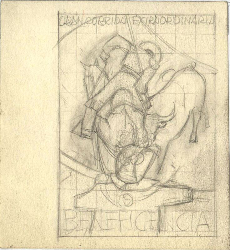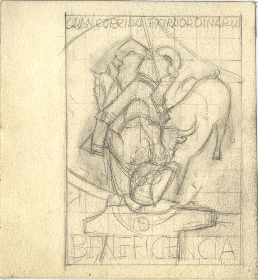 - Sobre una superficie cuadriculada y en un dibujo enmarcado y a modo de boceto se representa la lid entre un torero y un toro bajo el lema de “beneficencia”. Predominan las líneas en tonos oscuros sobre un fondo claro.
