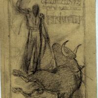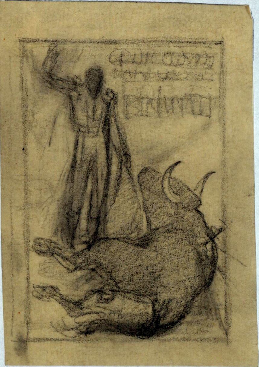 - Ante la figura estilizada de un torero que alza su brazo derecho hacia arriba se encuentra la figura de un toro negro y de gran tamaño muerto en la faena. El dibujo que es medio boceto se encuentra enmarcado. A la izquierda se ve alguna inscripción pero de difícil comprensión ya que se tratan de bocetos de palabras.