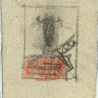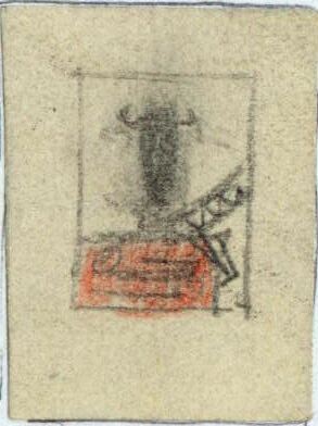 - Parece apreciarse en este boceto enmarcado en el centro de la composición, donde destacan los colores rojo y negro, la figura de una cabeza de toro.