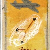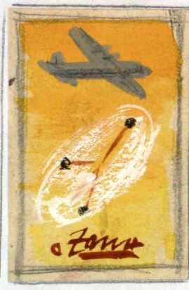 - Sobre un fondo amarillo muy fuerte y en el dibujo enmarcado se vislumbra la imagen de un avión gris sobrevolando el cielo. En el centro de la imagen se destacan pequeñas explosiones formando haces de color rojizo. En la parte inferior se destaca el lema de “zona” en color rojo.
