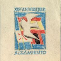- En el centro del dibujo enmarcado en un cuadrado pequeño se ha representado a una paloma blanca sobre un fondo azul en el que ondean tres banderas, entre ellas la española. Las demás banderas son de color blanco con un dibujo rojo y la otra es a rayas negras y rojas. Las palabras del lema se sitúan por encima y por debajo de la imagen.
