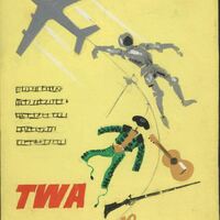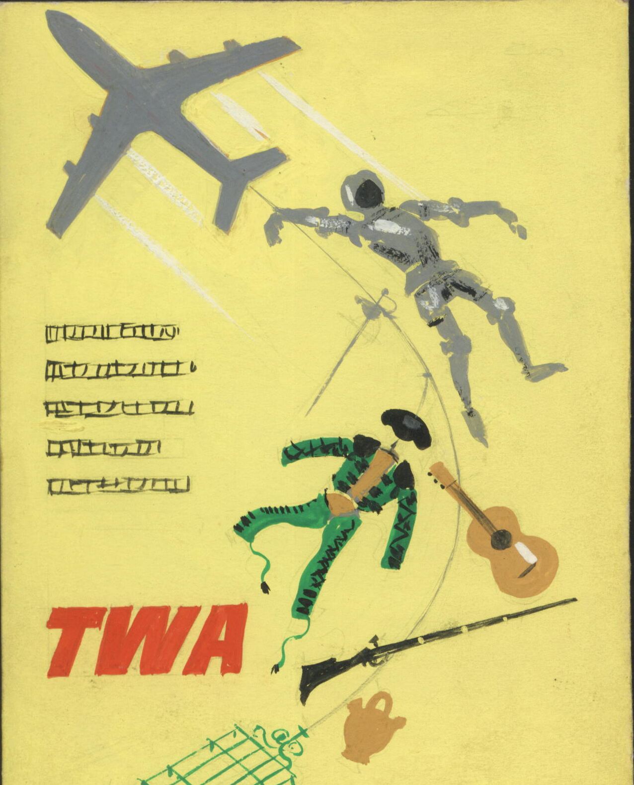 - Bajo el lema de “TWA” y sobre un fondo amarillo se ve un avión gris que arrastra detrás de si, mediante un hilo, a varias figuras entre las que se encuentran: un guerrero con armadura medieval, un florete, un torero con su traje de luces verde, una guitarra, una escopeta, un botijo y una jaula verde. Se pueden apreciar, a la derecha, bocetos de palabras de imposible lectura.