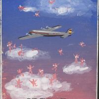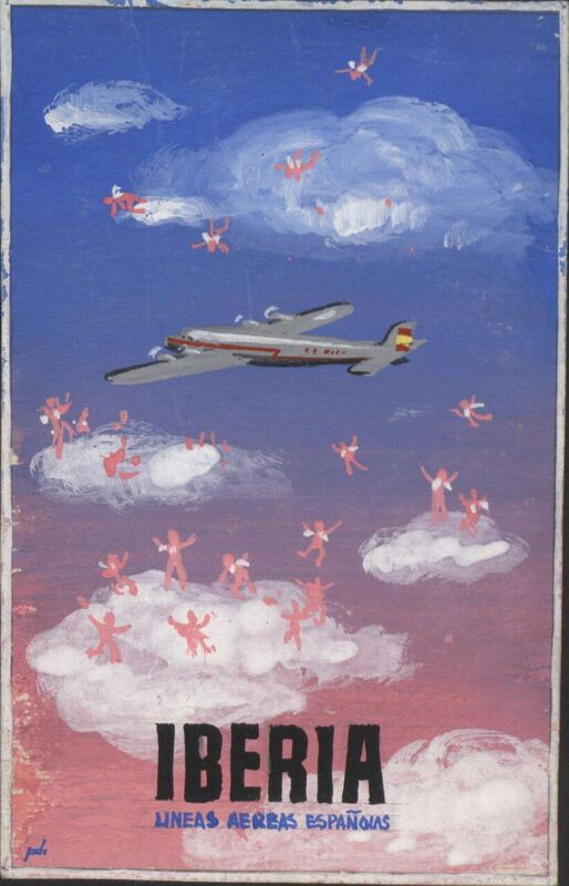 - En este cartel que promociona las líneas aéreas nacionales de Iberia se ve representado un avión en un cielo rosáceo y azul. A su alrededor, en las nubes blancas, pequeños ángeles rosas gesticulan con sus brazos al avión.Boceto realizado para Iberia