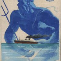 La figura del rey de los mares, Neptuno, de color azul y con su tridente se levanta de las aguas azules y transparentes que aparecen en primer término y sobre las que navega un barco. Las letras del lema que están en la parte inferior son también de color azul. En la parte superior de la composición, a la izquierda, se aprecia un escudo azul y rojo.
