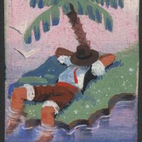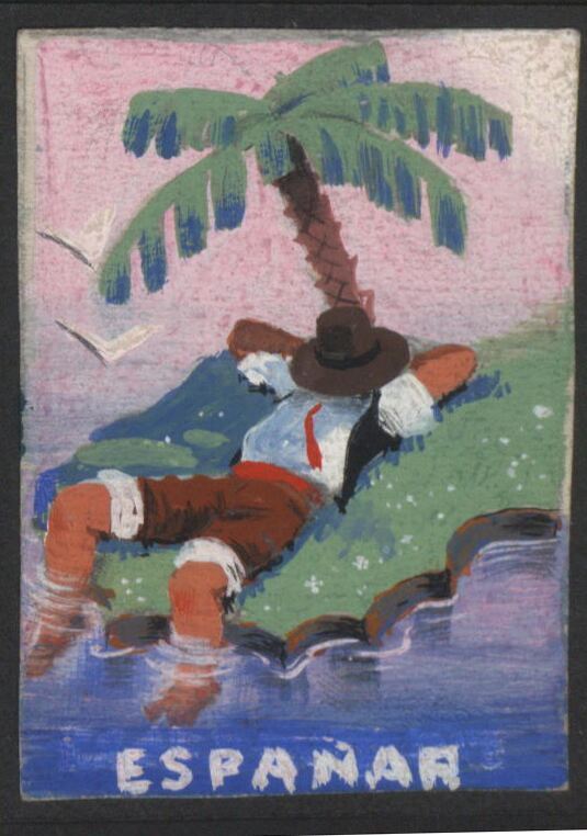 - Sobre las aguas del mar de color azul se ha formado una isla verde con la forma del mapa de la Península Ibérica. Bajo una palmera un hombre con camisa blanca y pantalón rojo descansa cubriendo su cabeza con un sombrero castaño mientras moja sus pies en el agua. En la parte inferior del dibujo enmarcado se puede leer en letras blancas “espanar”.