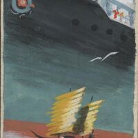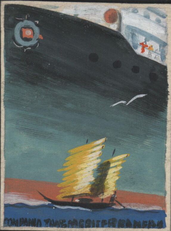 - Bajo el lema de “compañía mediterránea” se han representado dos barcos. De uno solo se aprecia el casco de color verde y rojo. El otro, al lado del anterior, de un tamaño pequeño navega las aguas azules empujado por velas amarillas.