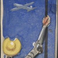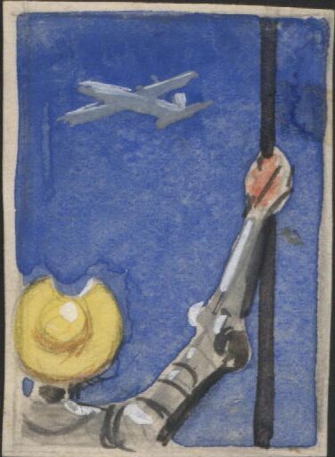 - En este dibujo enmarcado se ve la figura de Don Quijote de espalda, con su armadura reluciente, yelmo dorado y su lanza negra observando el vuelo de un avión sobre un cielo muy azul.