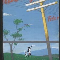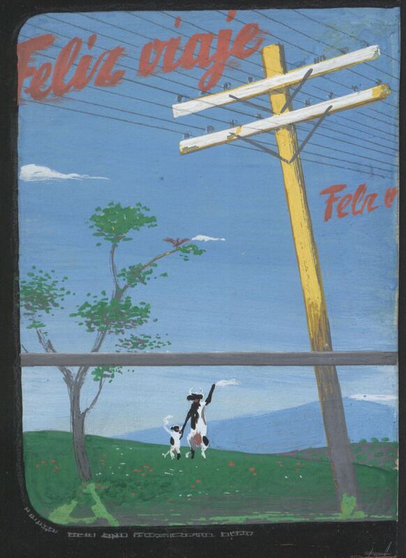 - En un paisaje de verdes prados y cielo muy azul donde dos figuras humanas a lo lejos dicen adiós se vislumbra un poste de cables eléctricos sobre los que se ha escrito el lema de este dibujo enmarcado: “feliz viaje”, en color rojo.