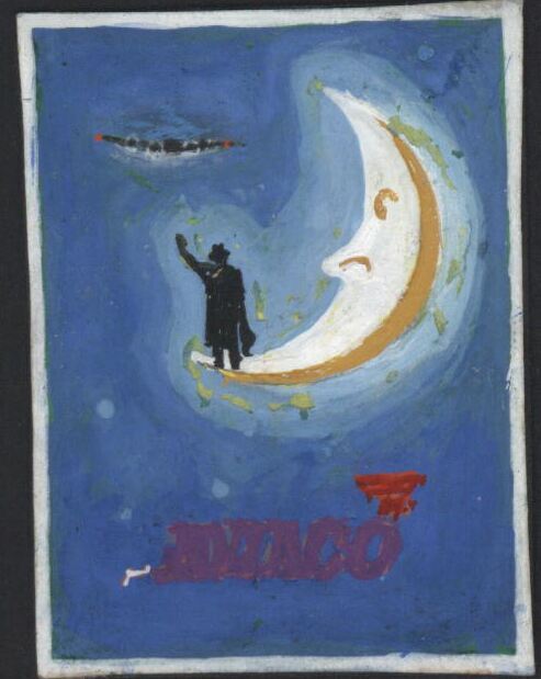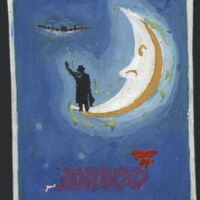 En este dibujo enmarcado vislumbrándose un fondo negro hay una inscripción morada de difícil lectura. Se ha representado sobre un fondo azul oscuro una gran luna blanca con ojos y boca. En una de sus puntas un hombre negro y de pie saluda gesticulando con una mano. Por detrás de esta figura se encuentra un avión. Parece verse, además, a la derecha del título del dibujo el boceto en color blanco de la firma del pintor.