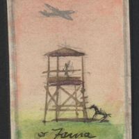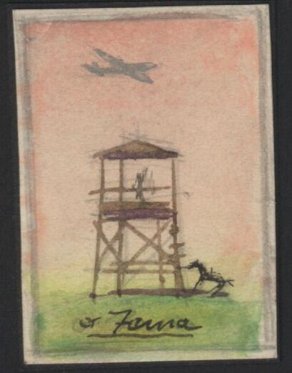 - En este dibujo que tiene una inscripción en color negro y de difícil lectura en la parte inferior se ha representado un paisaje de verdes prados sobre los que se ha levantado una torre de vigía en cuyo interior hay un hombre. Un caballo negro está atado a un poste y sobre un cielo rosado vuela un avión. El dibujo está enmarcado vislumbrándose un fondo negro.