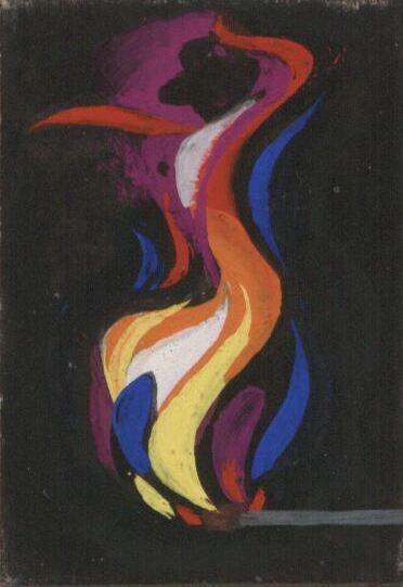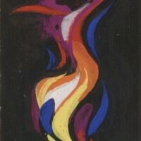 - Varios colores como el rojo, azul, amarillo y morado en forma de llamas se unen para formar una figura humana con sombrero. El fondo del dibujo es completamente negro.
