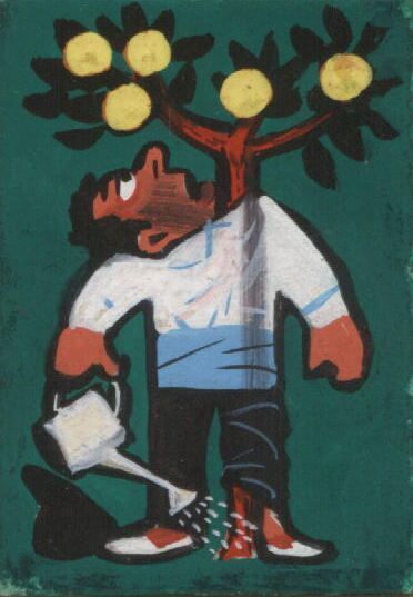 En un fondo verde destaca la imagen de un hombre que mientras riega un árbol mira asombrado como crece la planta por el interior de su ropa. El hombre lleva un pantalón negro y una camiseta blanca y azul con los zapatos blancos. En la copa del árbol destacan verdes hojas y frutos amarillos. Su cuerpo está de frente, en su mano derecha coge el regador y eleva su cabeza hacia arriba como si observase un extraño fenómeno.