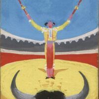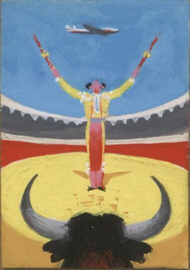 Sobre una plaza de toros en plena faena entre el toro y el torero con una banderilla en cada mano lanzándolas hacia arriba vuela un avión en un cielo muy azul. Del toro que está de espalda solamente se ve su cabeza con grandes cuernos. En segundo término aparece la figura del torero con el traje de luces amarillo. La arena sobre la que pisan es amarilla y las gradas de la plaza son grises con sus paredes rojas.