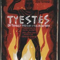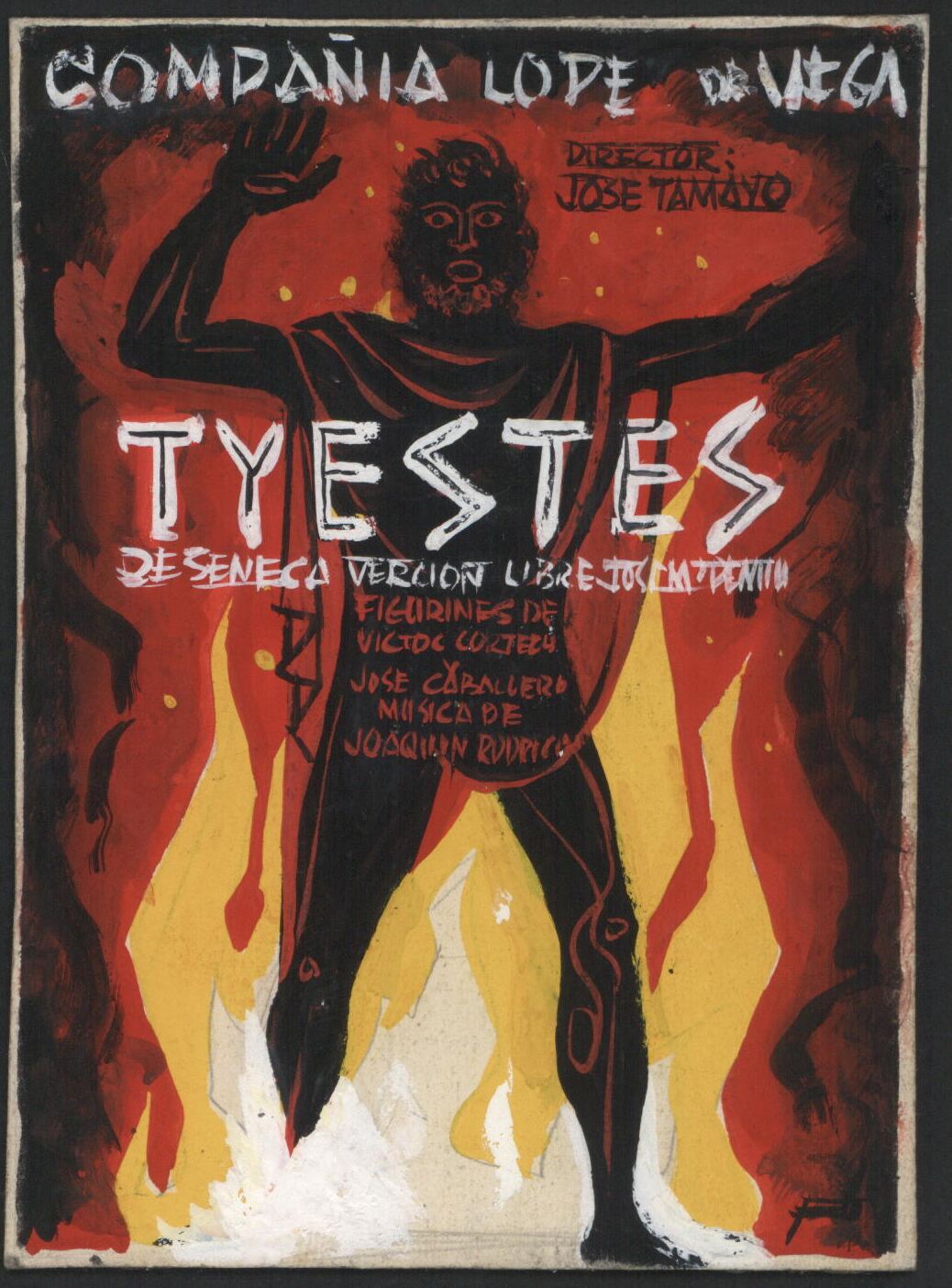 Para la compañía Lope de Vega bajo la dirección de José Tamayo se representa la obra de “Tyestes” como se puede leer en letras blancas y en el centro del cartel. En la composición del cartel se levanta de entre las llamas amarillas, sobre un fondo rojo y negro, la figura de un hombre negro de estilo clásico alzando sus brazos hacia arriba. Bajo el título se lee en color rojo: Figurines de Víctor Cortery y José Caballero; Música de Joaquín Rodrigo. A la izquierda, en la esquina de la parte inferior, se puede vislumbrar la firma del pintor. El dibujo está enmarcado por una línea blanca.