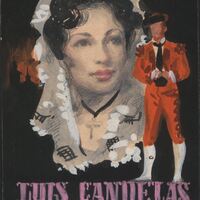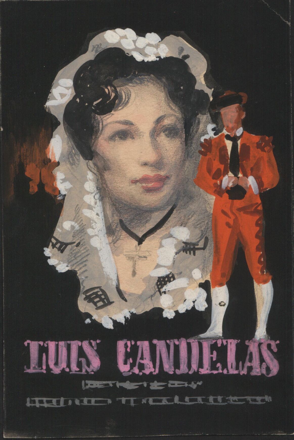 Sobre un fondo negro vislumbrándose, a la derecha, las cúpulas de edificios religiosos de una ciudad se ha representado la imagen facial de una mujer muy bella de pelo negro que lleva su cabeza cubierta con una mantilla blanca. Del cuello le cuelga una cruz. Superpuesta a esta imagen se ve la figura de un hombre, en cuerpo entero, al estilo torero con un traje rojo y medias blancas. En la parte inferior se lee el título de la obra: “Luis Candelas” en color morado.