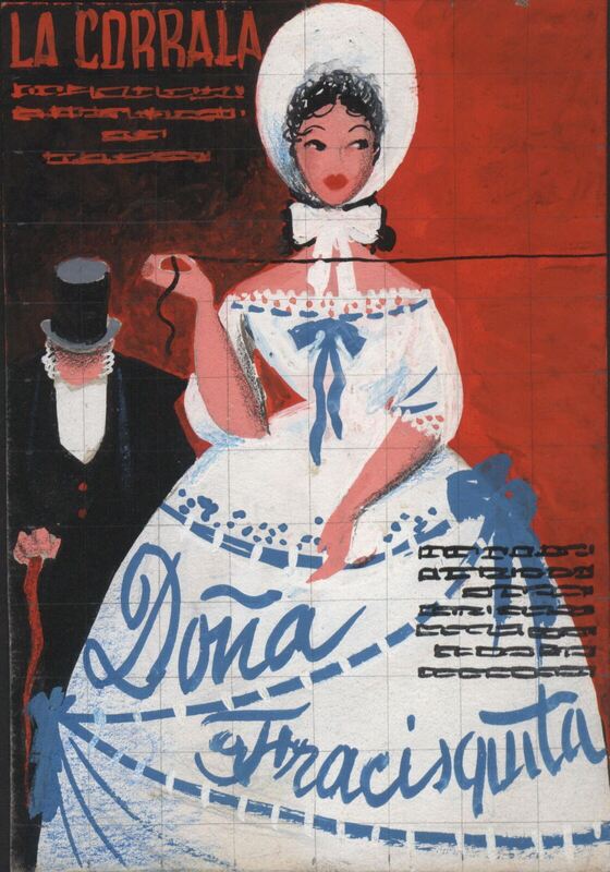 En el centro de la composición de este cartel se ha dibujado sobre un fondo rojo la imagen de una mujer que sostiene en su mano derecha un hilo negro, con sombrero y con un traje de época blanco con lazos azules y sobre el que se puede leer la obra que se representa: Doña Francisquita, también en letras azules. En segundo plano se ve la figura de un hombre con traje y sombrero negro agachando la cabeza. En letras de color rojo y en la parte superior se lee: La Corrala. Por debajo de esta palabra, en rojo, como al lado del título, en negro, se ven letras abocetadas de imposible lectura.